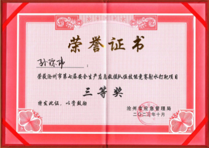 ? ?Competition site, Hai Jiang Group team took the lead, in the bar grab bar pull-ups, running back, over 2m obstacle plate, climbing 6m poles, handling 40m liquid collection barrels and other projects in the performance of the performance can be seen, attracted continuous applause, and ultimately won the Cangzhou City, the seventh safety production emergency rescue team skills competition comprehensive exercise group second prize, the theoretical knowledge of the group third prize, and the three team members were awarded the personal Project third prize. A total of five awards of excellent results, in a number of teams in the top.