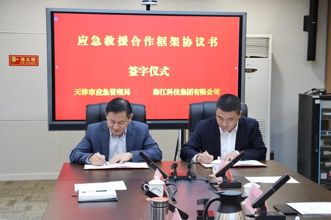 In order to thoroughly implement the important remarks of General Secretary Xi Jinping on emergency management, strengthen the construction of emergency rescue capacity in Tianjin, enhance the emergency response capacity, and effectively protect the lives and properties of the general public, on November 30, Tianjin Emergency Management Bureau and Haijiang Group jointly signed the Framework Agreement on Emergency Rescue Cooperation. Jiao Yong, member of the party committee and deputy director of Tianjin Emergency Management Bureau, and Liu Haijiang, chairman of Haijiang Group, signed on behalf of both parties.