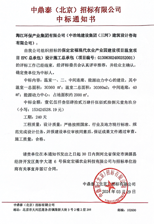 ? ? ? ?3月29日,北京海江控股集團(tuán)旗下子公司海江環(huán)保產(chǎn)業(yè)集團(tuán)有限公司中標(biāo)保定宏?,F(xiàn)代農(nóng)業(yè)產(chǎn)業(yè)園建設(shè)項(xiàng)目溫室項(xiàng)目EPC總承包,這是繼呼和浩特和赤峰宏?,F(xiàn)代農(nóng)業(yè)產(chǎn)業(yè)園建設(shè)項(xiàng)目后的第三次中標(biāo)。成為老客戶的持續(xù)堅(jiān)定選擇,彰顯了海江集團(tuán)的卓越口碑、品牌信譽(yù)與綜合實(shí)力,是對(duì)海江集團(tuán)堅(jiān)守誠(chéng)信、創(chuàng)新和人文價(jià)值觀的充分肯定。