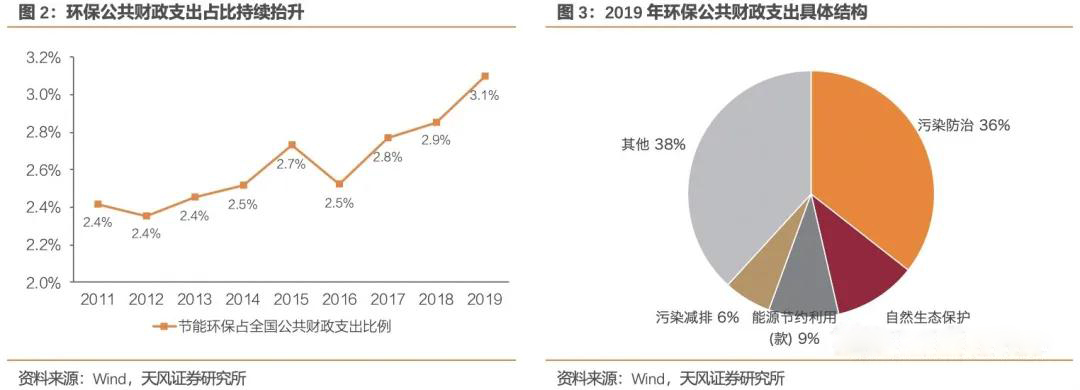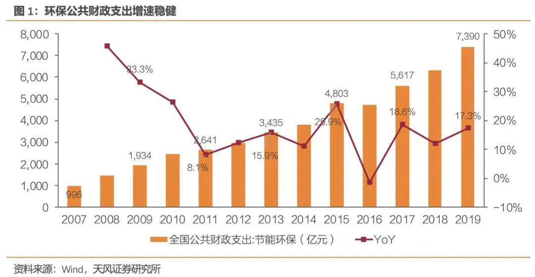 剛需屬性、優(yōu)化供給,環(huán)保有望將成為內(nèi)循環(huán)重要一環(huán)。一方面,環(huán)保剛需屬性明顯,本身即為需求重要組成部分。污染防治是我國全面建設(shè)小康社會的三大攻堅戰(zhàn)之一,同時也是環(huán)保行業(yè)所要解決的核心問題,行業(yè)具有天然的剛需特點(diǎn)。另一方面,環(huán)保拔高供給質(zhì)量,也是大循環(huán)通道暢通的保障。從歷史趨勢來看,環(huán)保領(lǐng)域在國民經(jīng)濟(jì)中重視度持續(xù)提高,近年財政支出增速十分穩(wěn)健,2019年全國公共財政支出中節(jié)能環(huán)保支出7390億,同比增長17.3%,增幅環(huán)比抬升5.2個百分點(diǎn),連續(xù)三年增速保持10%以上,且環(huán)保支出占總公共財政支出比例同樣持續(xù)抬升,一路從2016年的2.5%抬升至2019年的3.1%。我們認(rèn)為,在國內(nèi)大循環(huán)的新發(fā)展格局下,環(huán)保有望將成為內(nèi)循環(huán)重要一環(huán),行業(yè)景氣度有望持續(xù)抬升。