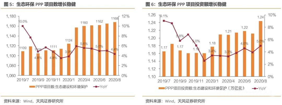 從中觀行業(yè)數(shù)據(jù)來看,景氣度抬升趨勢明晰,2020年暫受壓制。受疫情等方面因素影響,環(huán)保行業(yè)發(fā)展受到階段性壓制,固定資產(chǎn)投資增速轉(zhuǎn)負(fù),PPP項目增長進(jìn)程略有放緩。但從整體趨勢上看,行業(yè)層面修復(fù)十分明顯,固定資產(chǎn)投累計增速已從2月的-13.6%基本實(shí)現(xiàn)轉(zhuǎn)正,PPP項目方面,截至8月,生態(tài)環(huán)保PPP項目數(shù)為1168個,同比增加4.4%,投資額1.24萬億,同比增長5.0%。