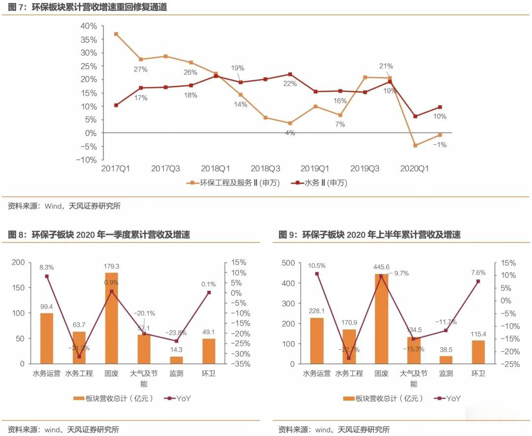 從微觀主體經(jīng)營狀況來看,持續(xù)修復(fù)、重回景氣。2020年一季度,環(huán)保企業(yè)經(jīng)營受疫情影響明顯,具體表現(xiàn)為工程進(jìn)度延后、招投標(biāo)工作受阻、運(yùn)營需求下降等,整體營收及業(yè)績受到較大的拖累。但從半年報來看,行業(yè)整體修復(fù)狀況可觀,H1環(huán)保工程及服務(wù)、水務(wù)營收增速環(huán)比Q1分別修復(fù)了4.0和3.4個百分點(diǎn)。具體子行業(yè)來看,水務(wù)運(yùn)營、固廢以及環(huán)衛(wèi)體現(xiàn)出相對較高的景氣度,上半年營收同比分別增長10.5%、9.7%以及7.6%。