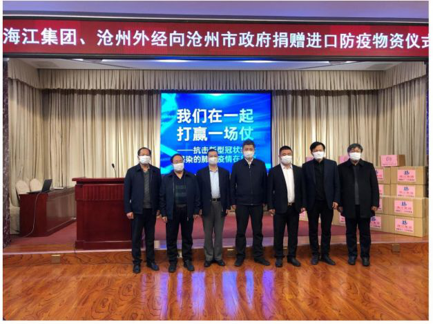1月31日15:00滄州市市長(zhǎng)梅世彤、副市長(zhǎng)劉強(qiáng)、秘書(shū)長(zhǎng)王彤、商務(wù)局局長(zhǎng)孫壽常、工信局局長(zhǎng)王健林、海江集團(tuán)董事長(zhǎng)劉海江、滄州市對(duì)外經(jīng)濟(jì)技術(shù)合作有限公司董事長(zhǎng)尹廣軍等出席捐贈(zèng)儀式。