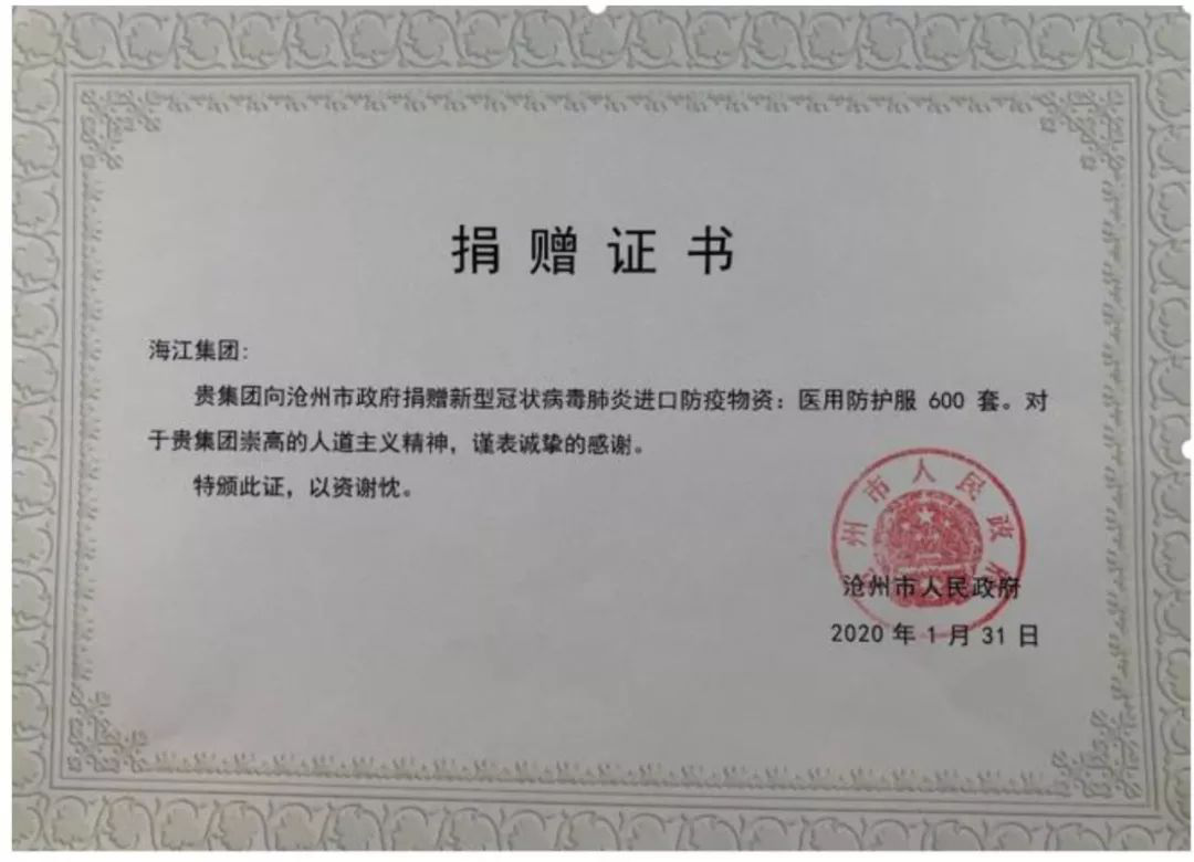 近期,湖北省武漢市等多個(gè)地區(qū)發(fā)生新型冠狀病毒肺炎疫情,牽動(dòng)著全國(guó)人民和海江人的心。在 1 月 25日(農(nóng)歷大年初一)召開(kāi)的中央政治局常委會(huì)上,習(xí)近平總書(shū)記再次強(qiáng)調(diào):“生命重于泰山,疫情就是命令,防控就是責(zé)任。”在這場(chǎng)突如其來(lái)的疫情面前,人人守土有責(zé),海江集團(tuán)不忘初心使命與社會(huì)責(zé)任!“心系家鄉(xiāng),全力支援,抗擊疫情”在國(guó)內(nèi)防疫醫(yī)療物資緊缺的情況下, 委托“滄州外經(jīng)”在國(guó)外加急采購(gòu)一批進(jìn)口醫(yī)療物資,無(wú)償捐助滄州市政府,為我市抗擊新型肺炎工作提供堅(jiān)實(shí)屏障。